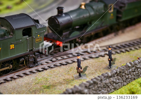 Close-up shot of miniature figures next to a model train track with detailed old-fashioned steam engine locomotives