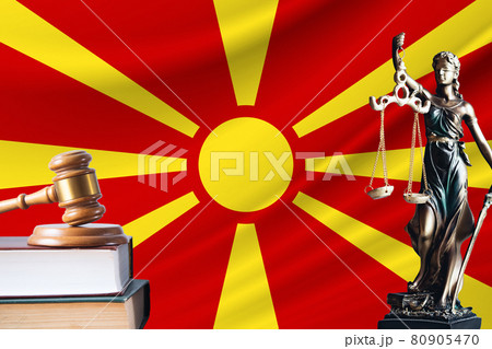 Law and justice in Northern Macedonia. Statue of themis and the gavel of the judge against the background of the flag of Northern Macedonia. Law and justice concept