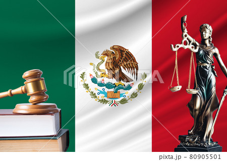 Law and justice in Mexico. Statue of themis and the gavel of the judge against the background of the flag of Mexico. Law and justice concept