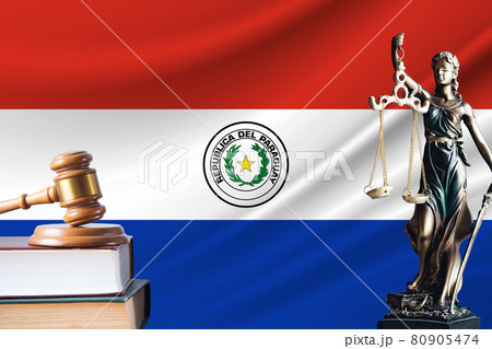 Law and justice in Paraguay. Statue of themis and the gavel of the judge against the background of the flag of Paraguay. Law and justice concept