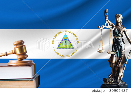 Law and justice in Nicaragua. Statue of themis and the gavel of the judge against the background of the flag of Nicaragua. Law and justice concept