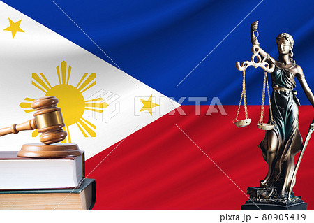 Law and justice in Philippines. Statue of themis and the gavel of the judge against the background of the flag of Philippines. Law and justice concept