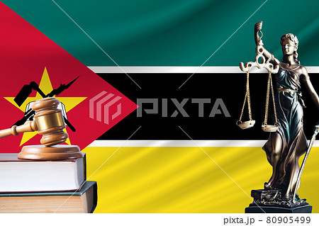 Law and justice in Mozambique. Statue of themis and the gavel of the judge against the background of the flag of Mozambique. Law and justice concept