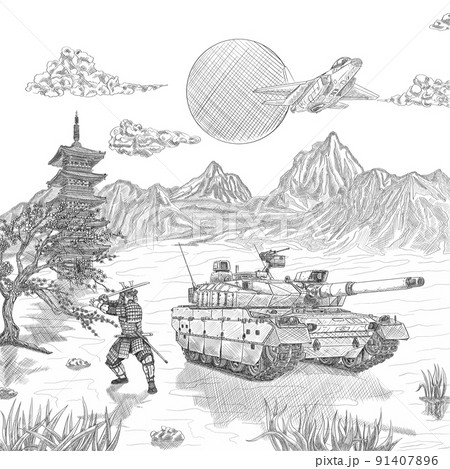 Illustration Connection of times. Japanese pagoda, samurai, cherry blossoms, fifth-generation aircraft, the latest battle tank.