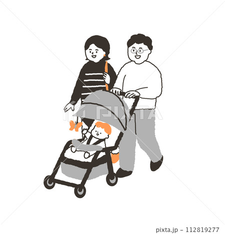 ベビーカーを使って散歩する赤ちゃん連れの親子
