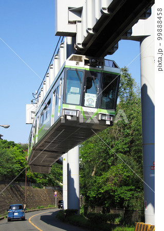 青空と緑をバックに走行する湘南モノレール