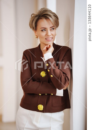 Woman poses in a brown jacket with gold buttons in a bright kitchen