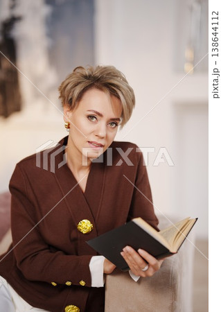 Woman sitting with a book in a cozy indoor setting in daylight