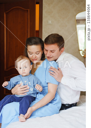Family portrait in a cozy bedroom with a young child