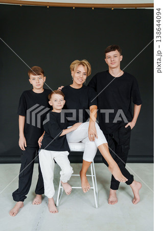 Mother and son in black shirts posing together in studio