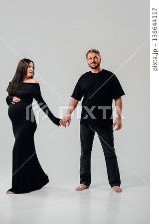 Expecting parents pose happily in bright studio setting