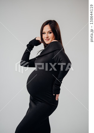 Beautiful pregnant woman in elegant black dress posing