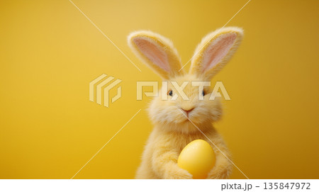 Fluffy yellow rabbit with easter egg on yellow background