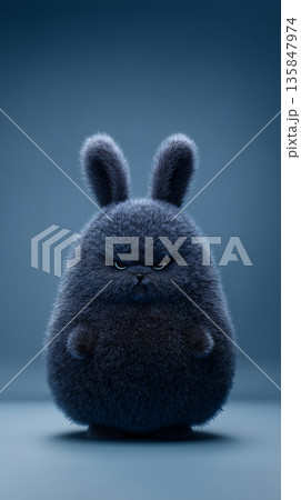 Grumpy fluffy bunny character on dark blue background