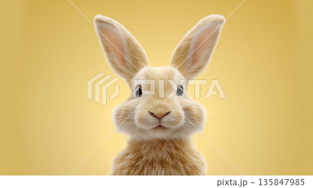 Smiling fluffy bunny on sunny yellow background