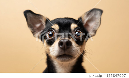 Close up portrait of cute black and tan chihuahua puppy with expressive eyes