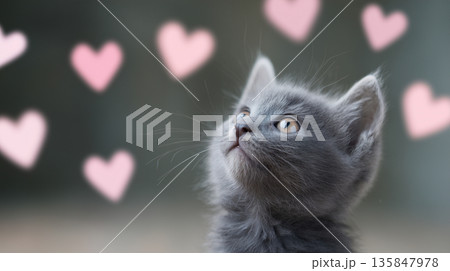 Adorable grey kitten gazing at floating pink hearts