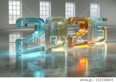 The transparent numbers 2026 glow in various shades, reflecting light in a spacious room. This artwork captures the anticipation of Christmas and New Year's Eve celebrations.