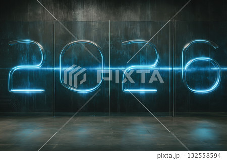 Shining blue neon numbers representing 2026 stand against a dark background, celebrating the upcoming Christmas and New Year’s Eve. A modern design captures festivity.