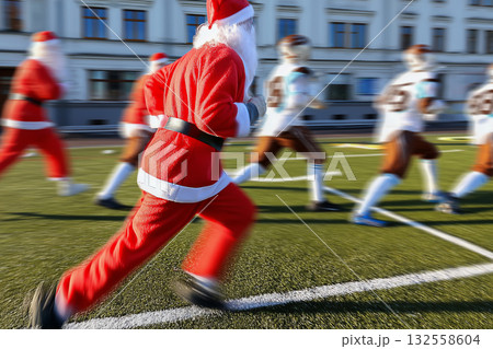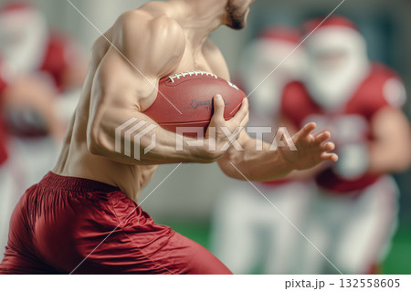 A muscular young Santa Claus is playing rugby with other santas. He runs with a rugby ball side view. Sports Christmas competitions.
