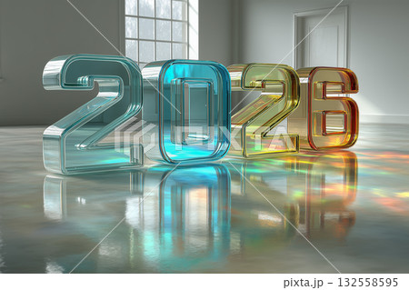 Glimmering numbers 2026 stand on a shiny floor, symbolizing the approaching New Year and Christmas festivities. The colorful glass shines brightly in anticipation of celebration.