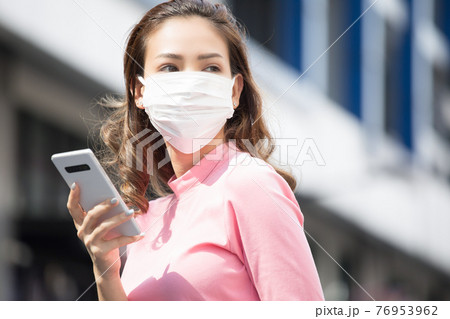 フェースマスクを付けて外で携帯を持っている若い女性