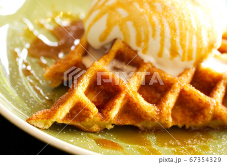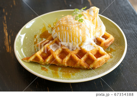 Cafe dessert Caramel Salty Waffle on top with whipping cream