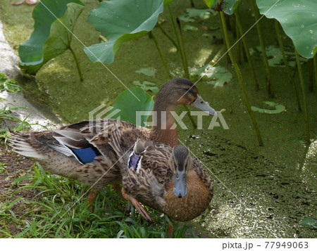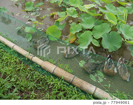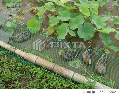 大分県臼杵市臼杵石仏のハス畑で合鴨農法で育ったカモたち