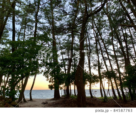 南島原市野田浜キャンプ場の木々からのぞく夕暮れ時 海に映えるオレンジの帯