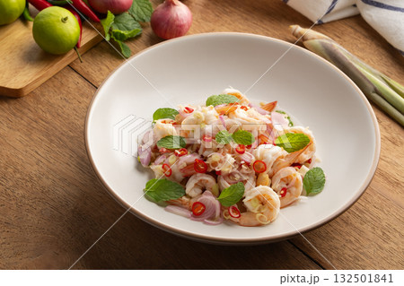 Spicy Lemongrass Salad with Shrimps in white plate.Thai food.