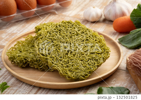 Close up Japanese style green noodles,Uncooked dry instant vegetable noodle,Crispy jade noodles in wooden plate