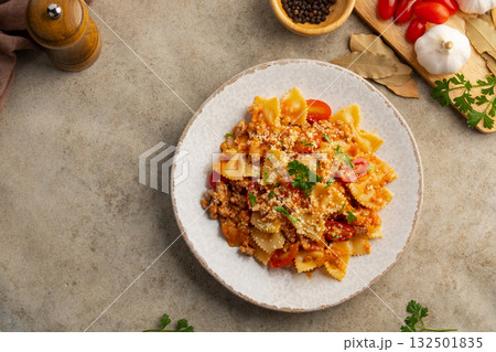 bowties pasta with Meat Sauce,Easy Farfalle with a simple tomato sauce with ground pork and beef in white plate.bolognese pasta.Top view.