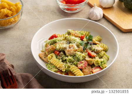 CHICKEN PESTO FUSILLI,fusilli pasta with broccoli pesto sauce and grilled chicken breast, cherry tomato in a plate.Top view.