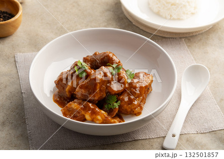 Honey Braised Pork Baby Back Ribs or pork cartilage with soy sauce in white plate.Top view copy space.