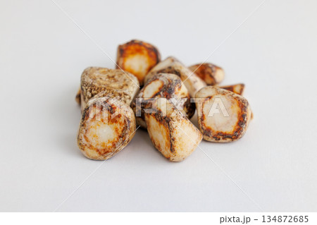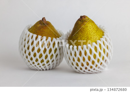 緩衝材(フルーツキャップ)付きのラ・フランス、白背景