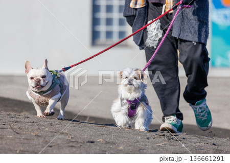 砂浜を飼い主と散歩する2匹の小型犬(フレンチブルドッグとシーズー)