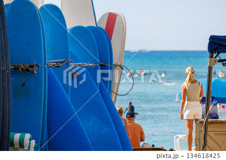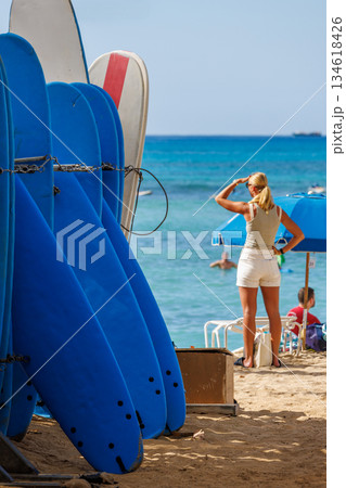 サーフボードと沖を見る女性の後ろ姿、ワイキキビーチ