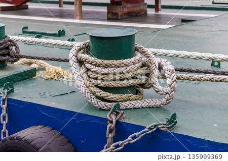 岸壁の係船柱(ボラード)に係止された太いもやいロープ