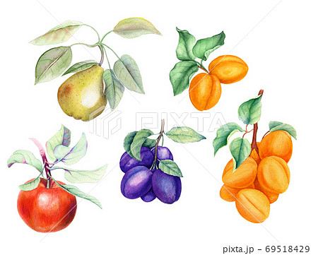 Set of fruits branches with green leaves isolated on a white background watercolor illustration suitable for food design