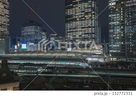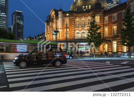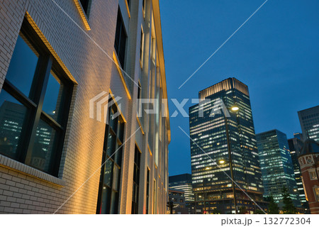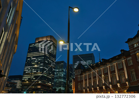 夕日に照らされる東京駅 夜に輝く夜のオフィス街 夜の交差点か帰宅するビジネスマン