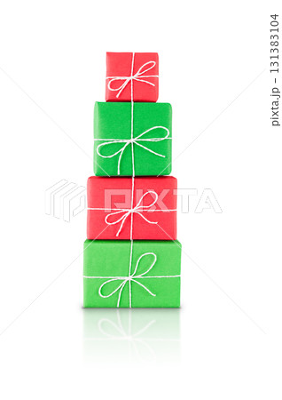 Pile of red and green wrapped gift boxes tied with white string, isolated on white background with reflection. Stock photo.