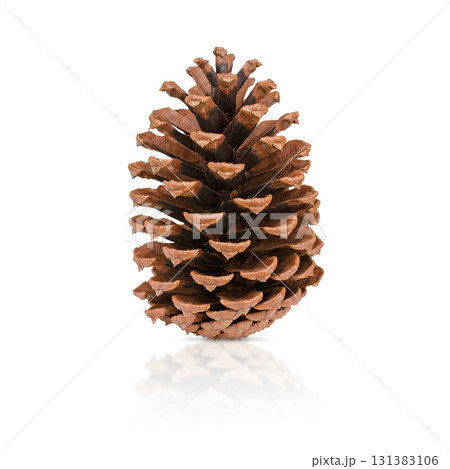 Brown pine cone isolated on white background with reflection. Stock photo.
