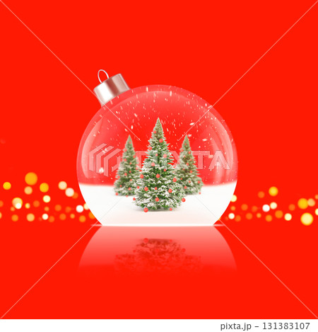Christmas ball ornament with snowy trees inside on red background. Stock photo.