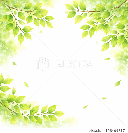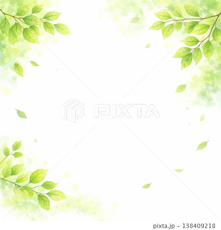 新緑の葉 背景素材 水彩イラスト 軽やかなコーナーフレーム ナチュラルでやさしい余白デザイン