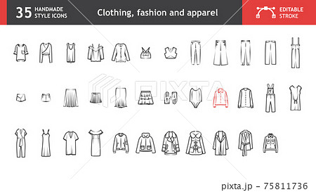 Clothing, fashion and apparel icons. T-shirts, blouses, tops, trousers, leggings, etc. 35 handmade style icons, vector images, with editable stroke. Ready to be used in any design project.