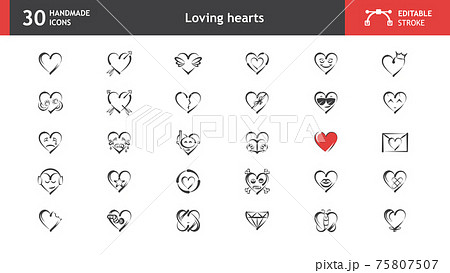 Romantic and funny loving heart icons. Broken, sad, happy, with arrows, etc. 30 handmade icons, vector images, with editable stroke. Ready to be used in any design project.