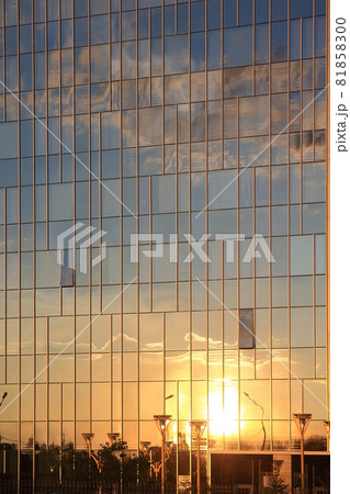 Sunset and clouds reflected in the glass facade of a skyscraper.
