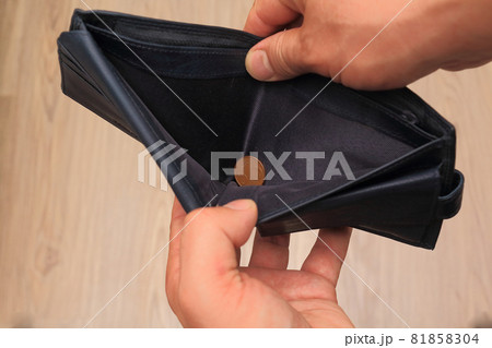 Man hand open leather wallet with five euro cent coin. Crisis concept.