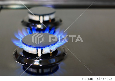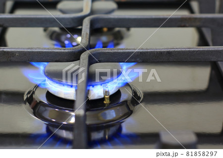 Modern kitchen stove cook with blue flames burning.
