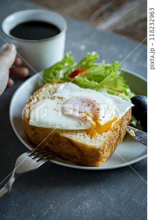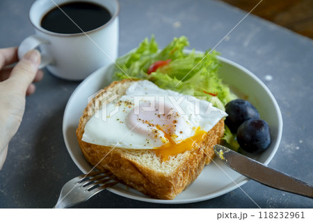 朝食の卵のトーストとコーヒー
